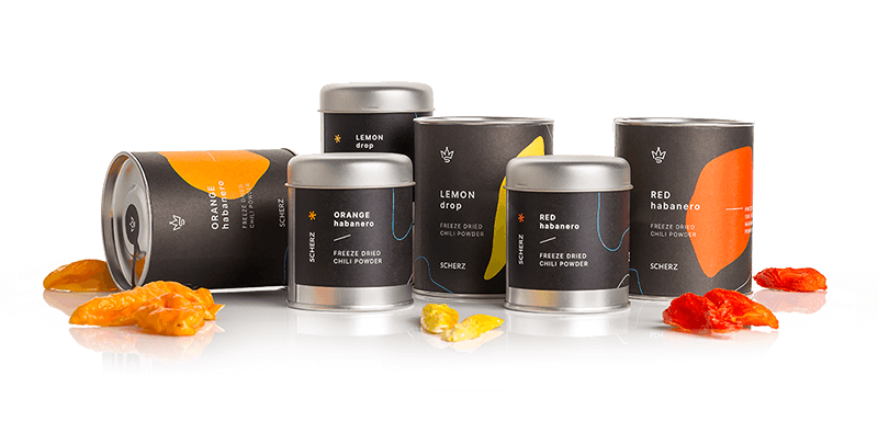 Scherz čili je edini čili na trgu, pridobljen s postopkom liofilizacije, kjer z globoko zamrznitvijo iz sadežev odvzamemo vodo.